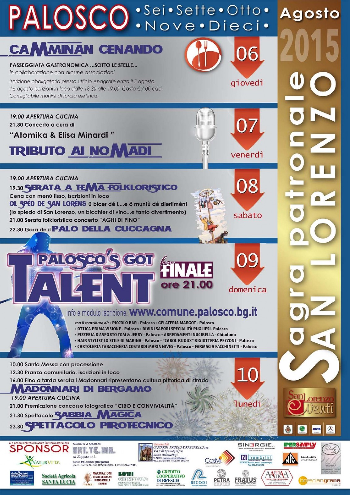 Tutte le sere cucina aperta, cene con menù fisso, concerti, madonnari. Domenica 9 finale di Palosco’s got talent con premiazione e alla sera grande spettacolo pirotecnico
