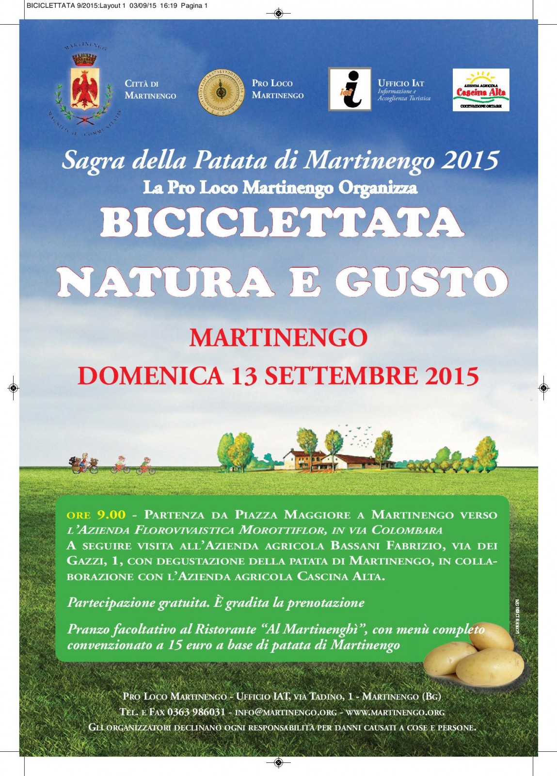 Domenica 13 settembre in occasione dell’apertura della sagra della patata si svolge la biciclettata “Natura e gusto”. Partenza alle 9 da Piazza Maggiore a Martinengo verso l’azienda florovivaistica Morotti in via Colombera.