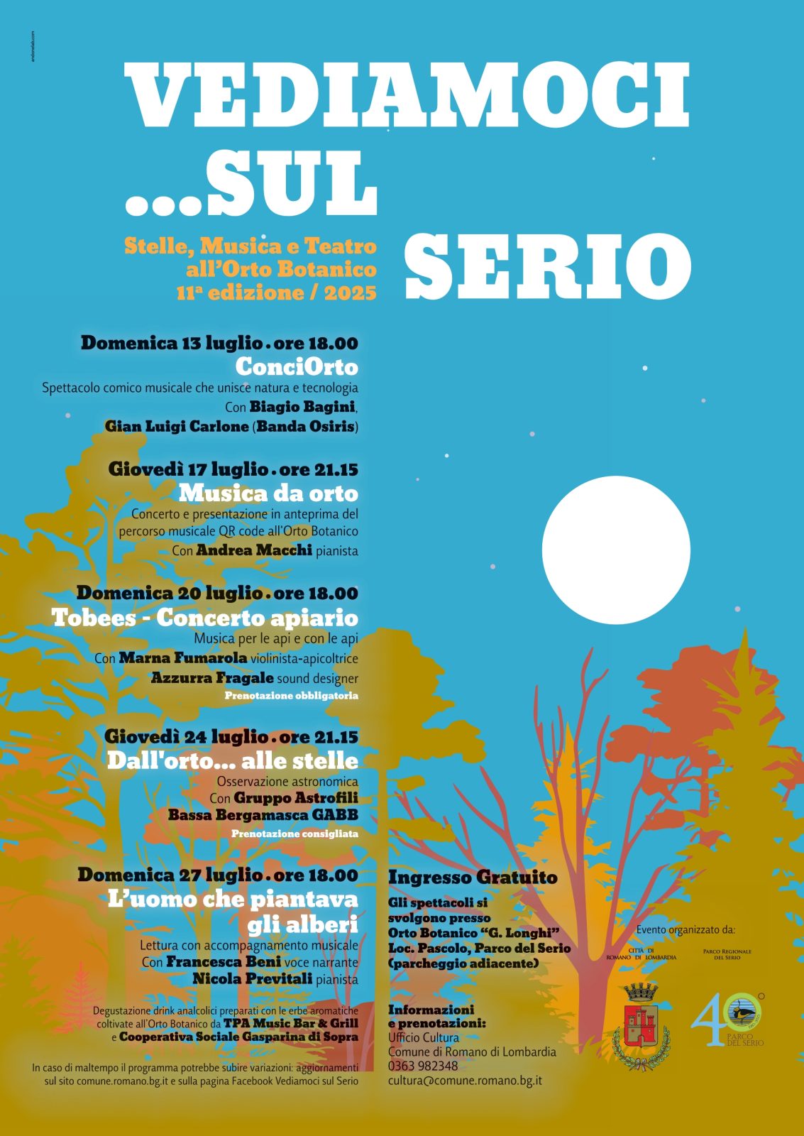 Parte domenica alle 18 presso l’Orto Botanico del Parco del Serio, “Giuseppe Longhi”, in località Pascolo a Romano di Lombardia (BG) con Conciorto, spettacolo comico e musicale che unisce natura e tecnologia con Biagio Bagini e Gian Luigi Carlone (Banda Osiris), l’undicesima edizione di “Vediamoci sul Serio”, rassegna che unisce arte e natura, tra teatro e musica, che vede il Parco del Serio collaborare con il comune di Romano di Lombardia. “Verdure, api, stelle, erbe e ancora musica e parole ci invitano a un ritorno alla natura e al tempo lento”, commentano dal Parco del Serio. La rassegna si articola in altri quattro appuntamenti nel mese di luglio, oltre a quello di domenica prossima: Giovedì 17 luglio alle 21,15 Musica da orto, concerto e presentazione in anteprima del percorso musicale QR Code all’Orto Botanico, con il pianista Andrea Macchi; Domenica 20 luglio alle 18, Tobees – concerto apiario, musica per le api e con le api, con Marna Fumarola, violinista-apicoltrice e Azzurra Fragale, Sound designer (Necessaria la prenotazione contattando cultura@comune.romano.bg.it – 0363 982348); Giovedì 24 luglio alle 21,15 Dall’orto… alle stelle, osservazione astronomica con il Gruppo Astrofili Bassa Bergamasca GABB (Consigliata la prenotazione); Domenica 27 luglio alle 18, L’uomo che piantava gli alberi, lettura con accompagnamento musicale con Francesca Beni, voce narrante e Nicola Previtali, pianista. Durante lo spettacolo sarà possibile degustare drink analcolici creati utilizzando le erbe aromatiche coltivate all’Orto Botanico, in collaborazione con TPA Music Bar & Grill e Cooperativa Sociale Gasparina di Sopra.