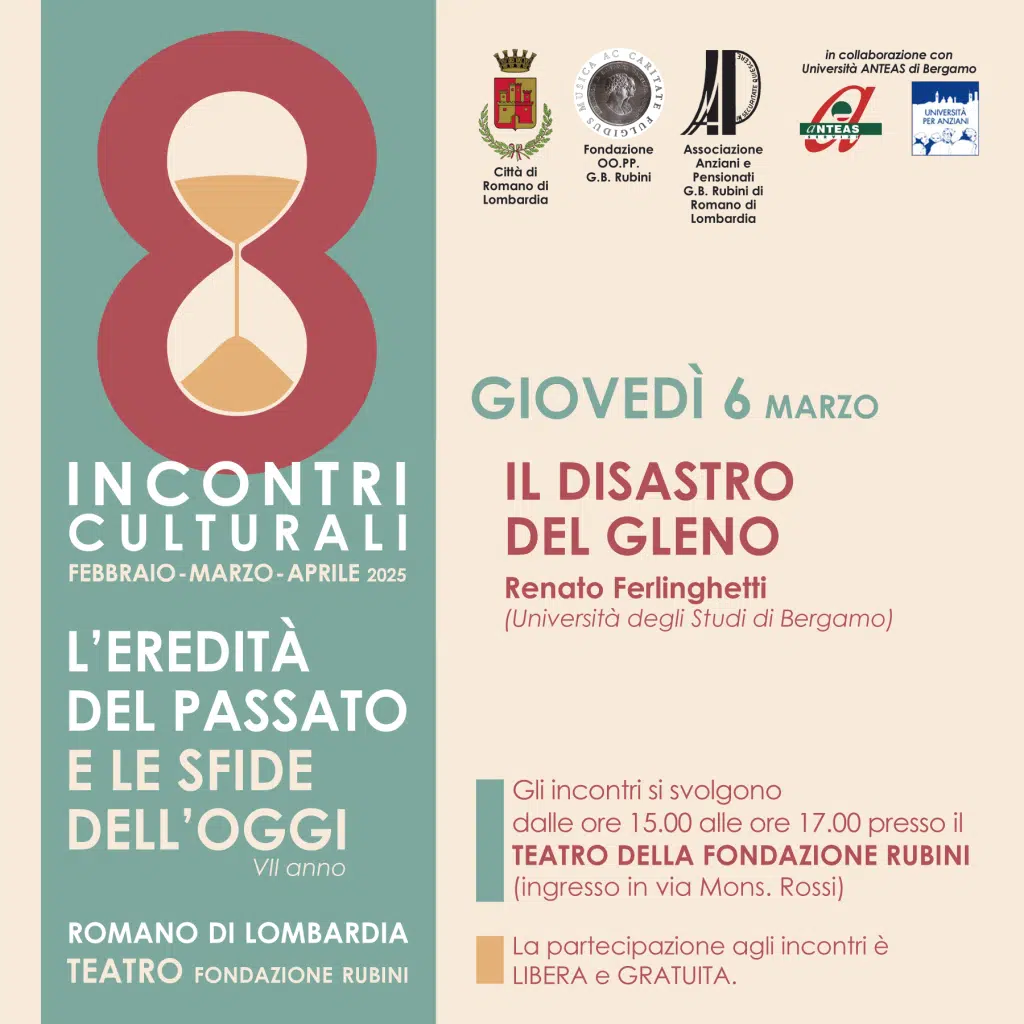 Giovedì 6 marzo dalle 15:00 alle 17:00, presso il Teatro della Fondazione Rubini a Romano di Lombardia, si terrà il terzo incontro culturale: “IL DISASTRO DEL GLENO” con Renato Ferlinghetti (Università degli Studi di Bergamo).