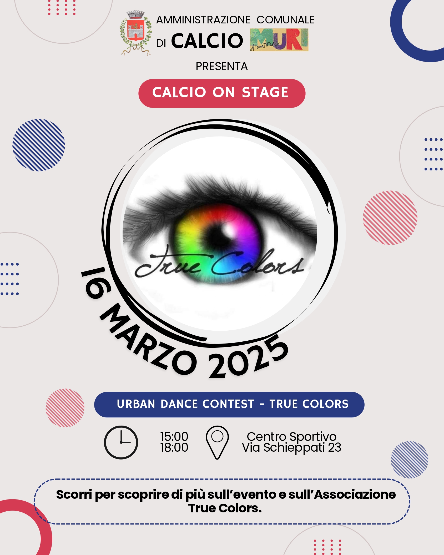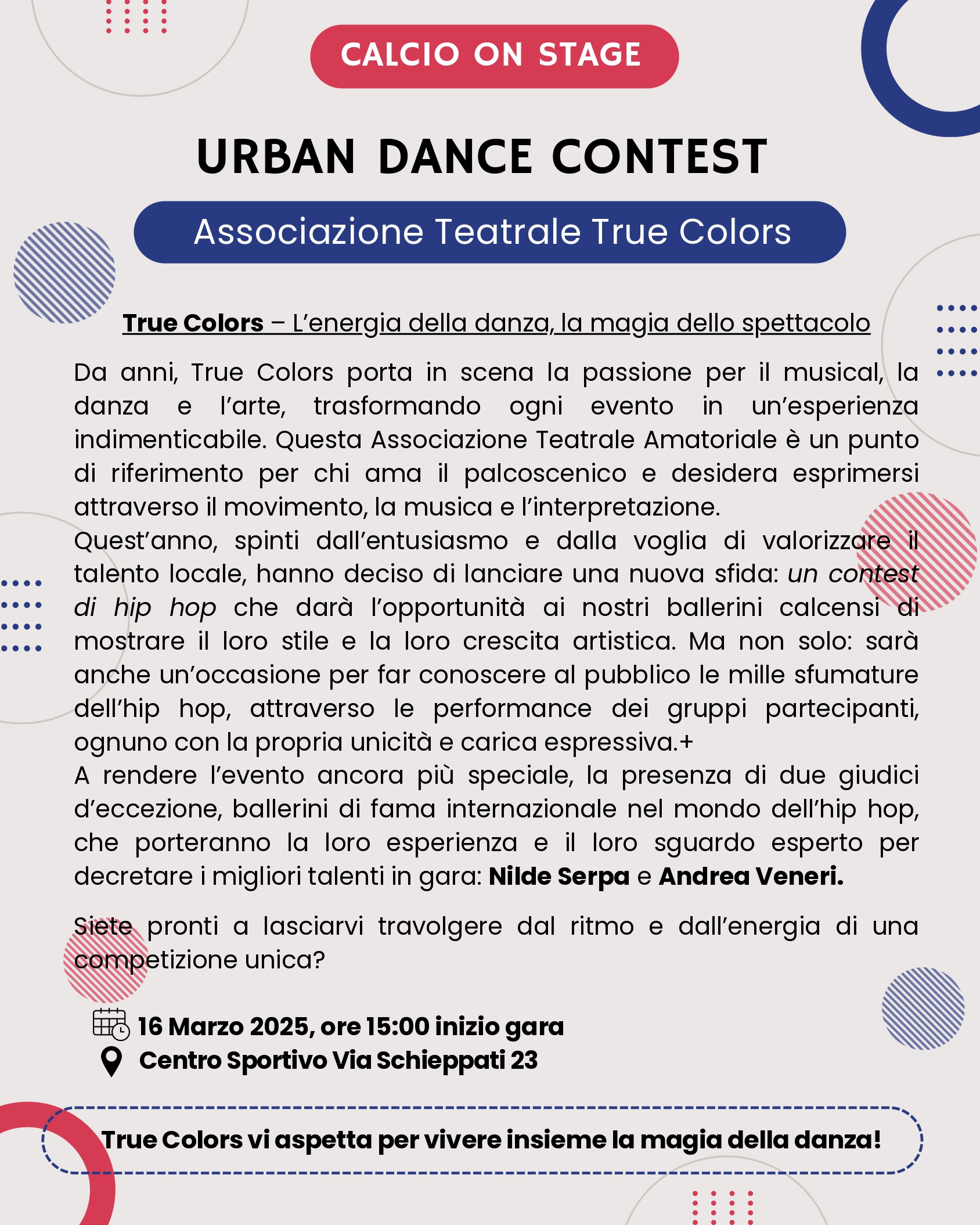 Domenica 16 marzo dalle 15:00 alle 18:00, presso il Centro sportivo di Calcio, si terrà l’evento Calcio on stage – Urban dance contest.