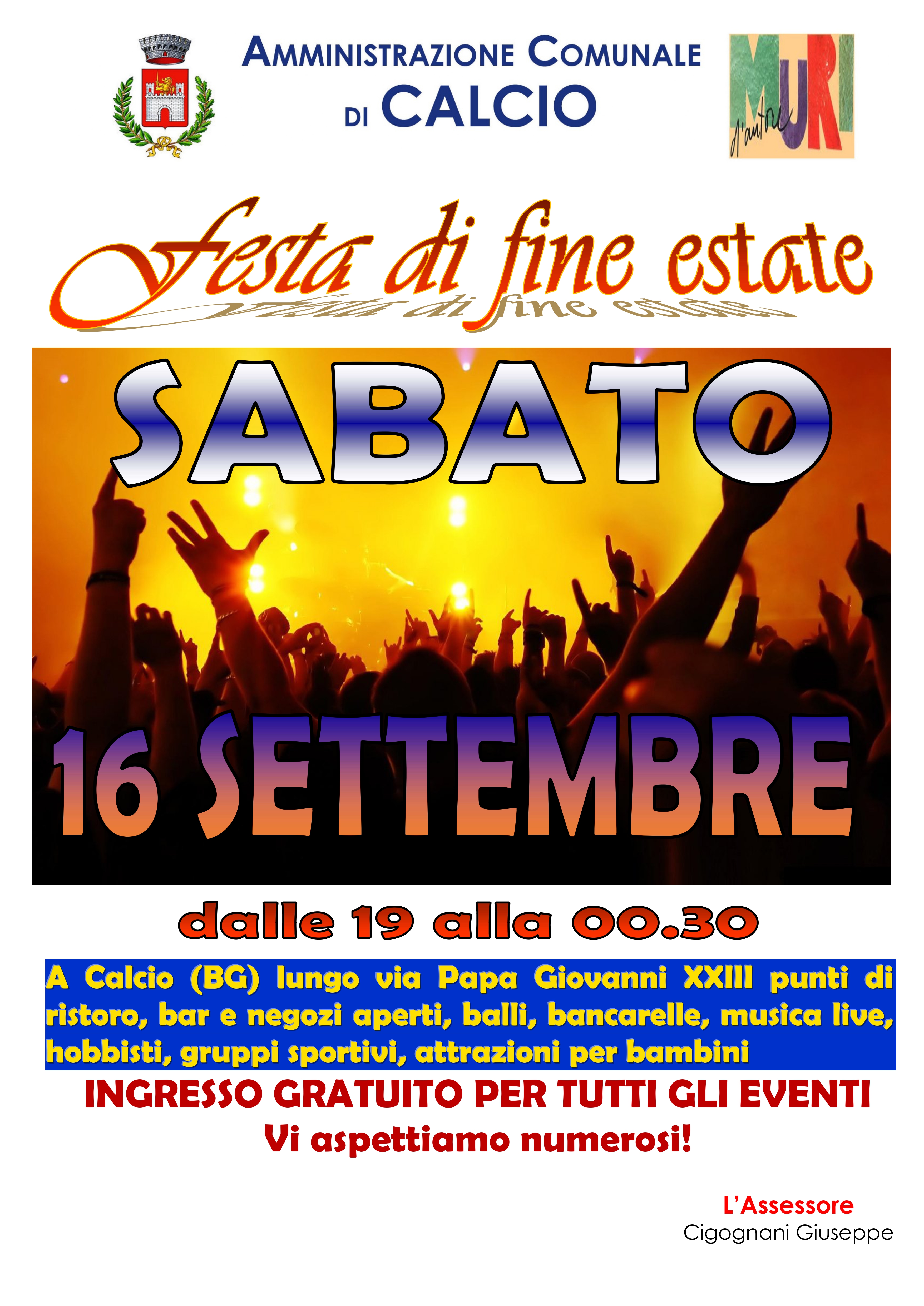 Home » Eventi » Calcio, “Festa di fine estate” Calcio, “Festa di fine estate” Pubblicato il 12 settembre 2023 da Diego Moratti Calendario Aggiungi al Calendario Aggiunti al Calendario di Timely Aggiungi a Google Aggiungi ad Outlook Aggiungi al Calendario Apple Aggiungi ad altro calendario Export to XML Quando: 16 settembre 2023@19:00 2023-09-16T19:00:00+02:00 2023-09-16T19:15:00+02:00 Evidenza Musica Sabato 16 settembre l’amministrazione comunale di Calcio vi invita alla Festa di fine estate. Dalle 19 lungo via Papa Giovanni XXIII. Ingresso gratuito