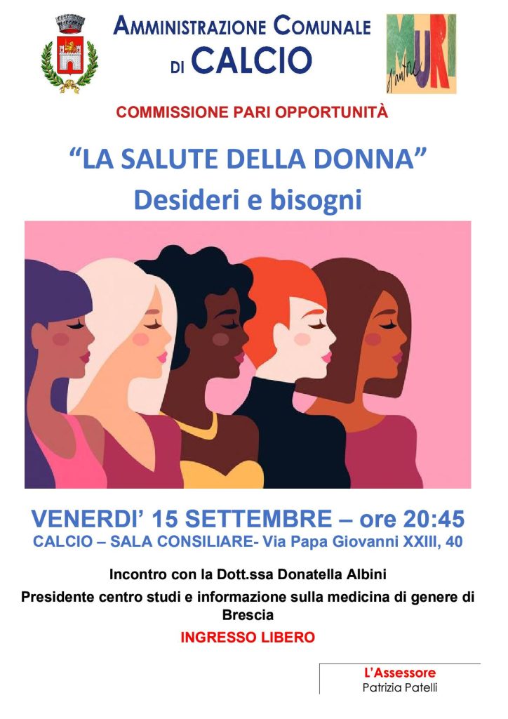 L’Amministrazione Comunale di Calcio e la Commissione alle Pari Opportunità vi invitano, questo venerdì 15 settembre all’incontro con la Dott.ssa Donatella Albini, Presidente del centro studi e informazione sulla medicina generale di Brescia, per parlare di “La salute della donna – desideri e bisogni”
