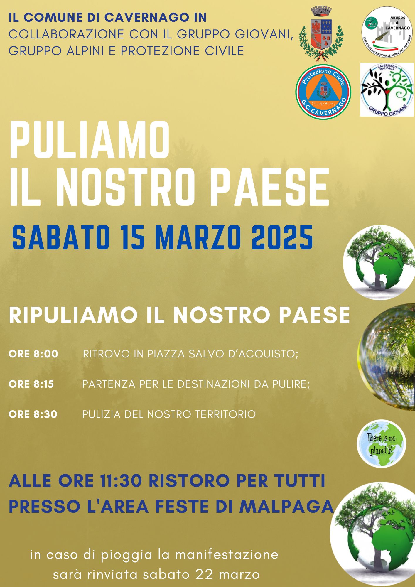 Sabato 15 marzo 2025, per la Giornata del Verde Pulito, il Comune di Cavernago in collaborazione con il Gruppo Giovani, Gruppo Alpini e Protezione Civile organizza la manifestazione “Puliamo il nostro paese”.
