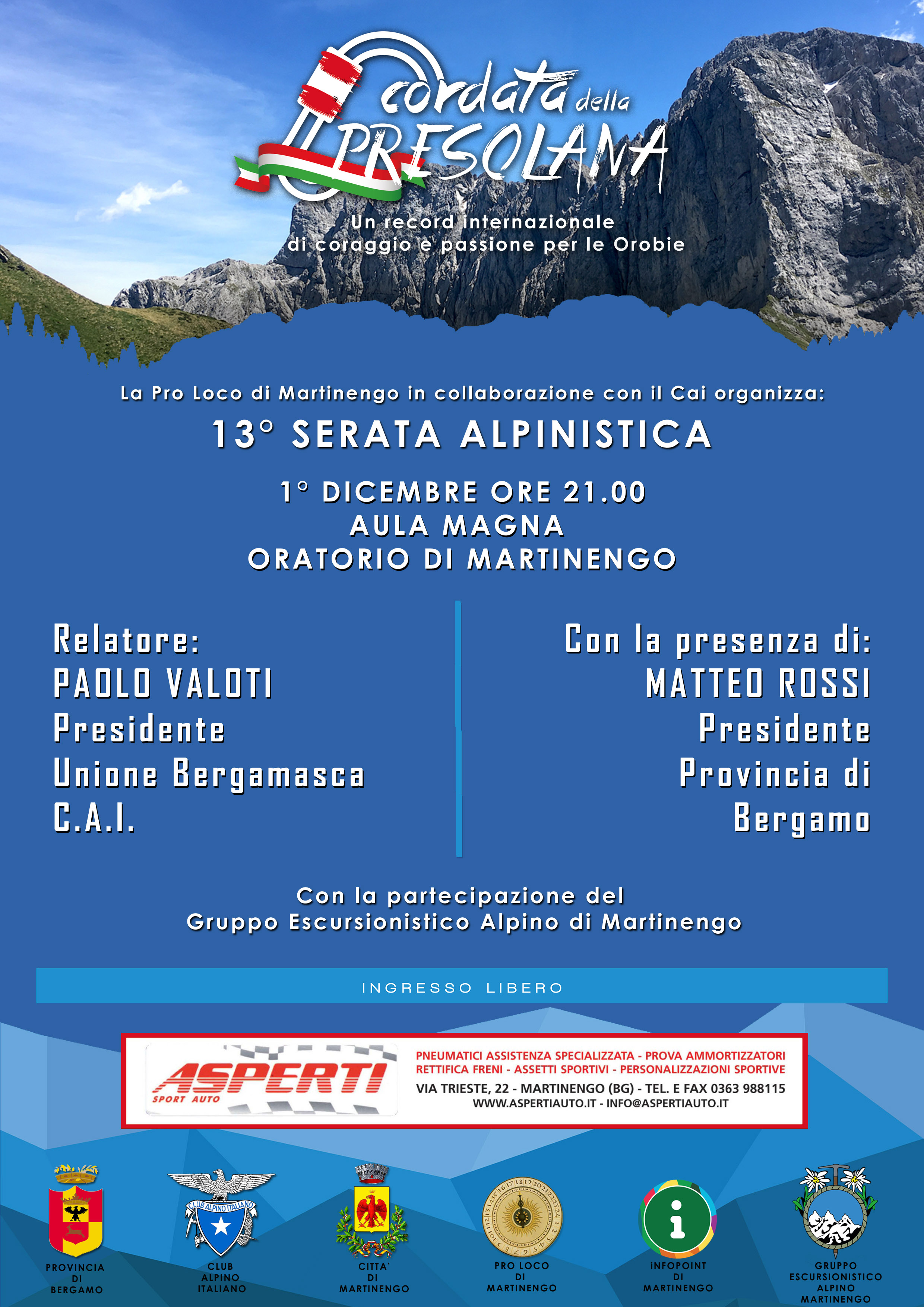 Venerdì 1° dicembre alle ore 21.00, presso l’aula magna dell’oratorio di Martinengo, si terrà la 13° serata alpinistica. L’evento, organizzato dalla Pro Loco in collaborazione con il Cai, ripercorrerà un record internazionale di coraggio e passione: la cordata della Presolana.