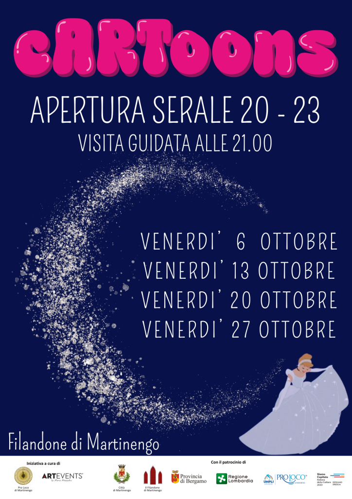 Tutti i venerdì sera dal 6 ottobre al 1° novembre, la speciale mostra “cARToons: come nasce un capolavoro” con bozzetti originali di Walt Disney, sarà visitabile anche la sera dalle 20.00 alle 23.00, oltre agli orari di apertura ordinari dalle 10.00 alle 12.00 e dalle 15.00 alle 18.00.