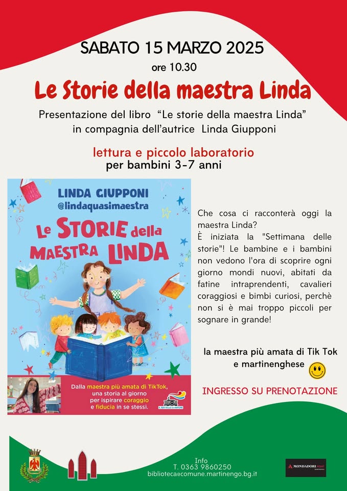 Sabato 15 marzo alle ore 10.30, presso la Biblioteca Comunale di Romano di Lombardia, presentazione del libro “Le Storie della maestra Linda” in compagnia dell’autrice Linda Giupponi. Lettura e piccolo laboratorio.