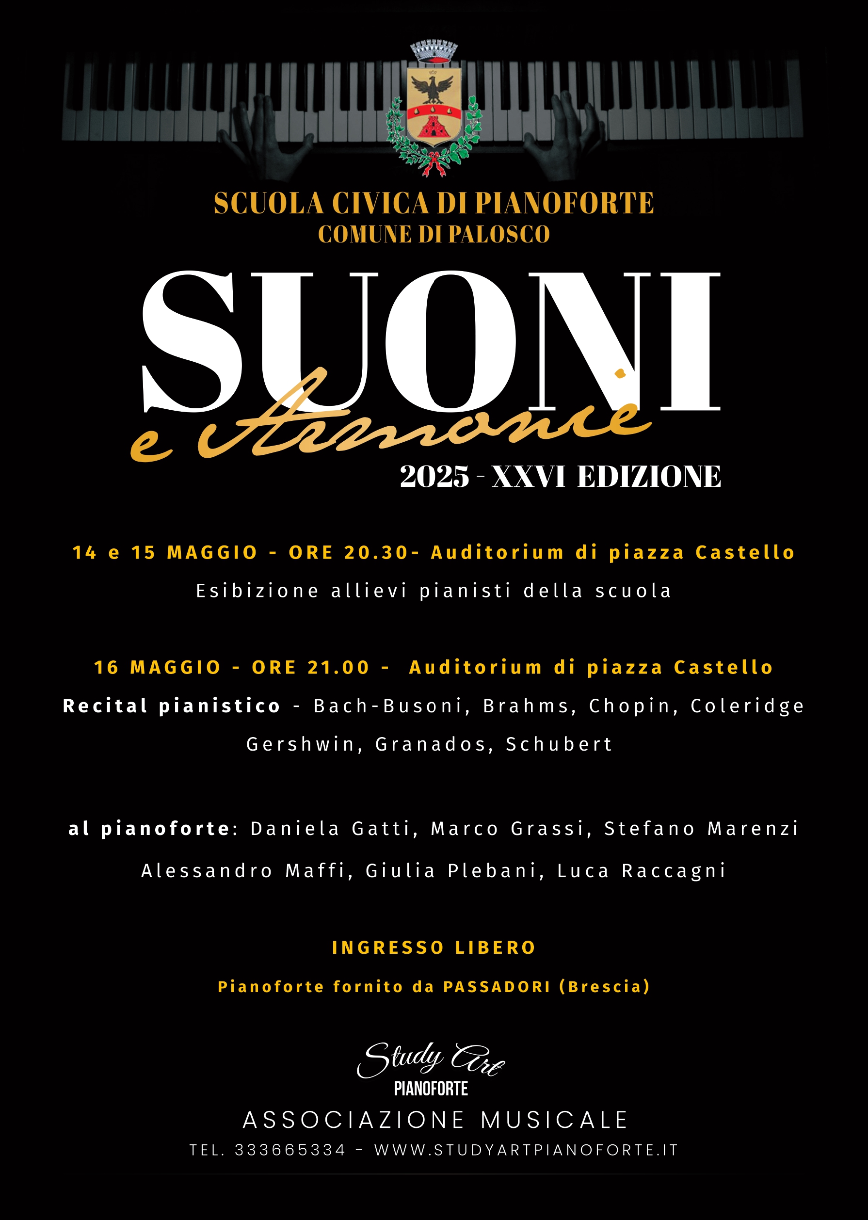 Mercoledì 14 e giovedì 15 maggio alle ore 20:30, presso l’Auditorium di piazza Castello, si terrà l’Esibizione degli allievi pianisti della Scuola Civica di Pianoforte del Comune di Palosco.