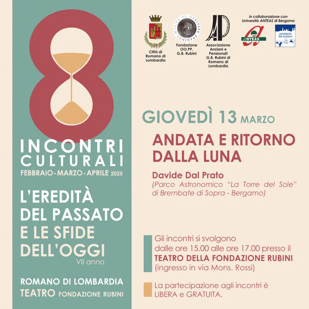 Giovedì 13 marzo dalle 15:00 alle 17:00, presso il Teatro della Fondazione Rubini a Romano di Lombardia, si terrà il quarto incontro culturale: “ANDATA E RITORNO DALLA LUNA” con Davide Dal Prato (Parco Astronomico “La Torre del Sole” di Brembate di Sopra – Bergamo).