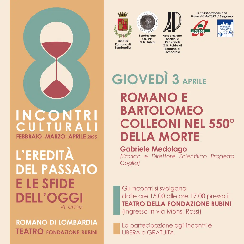 Giovedì 3 aprile dalle 15:00 alle 17:00, presso il Teatro della Fondazione Rubini a Romano di Lombardia, si terrà il settimo incontro culturale: “ROMANO E BARTOLOMEO COLLEONI NEL 550° DELLA MORTE” con Gabriele Medolago ( Storico e Direttore Scientifico Progetto Coglia).