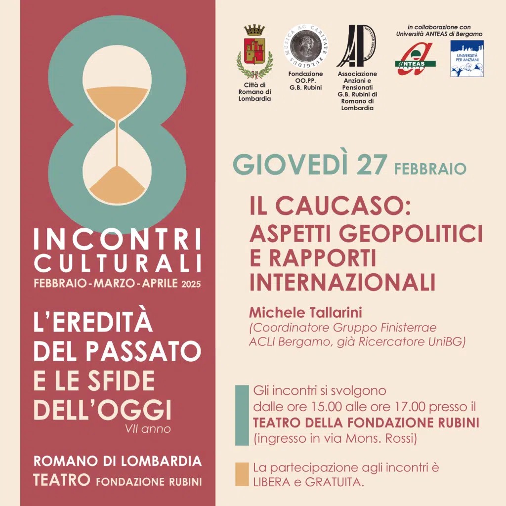 Giovedì 27 febbraio dalle 15:00 alle 17:00, presso il TEATRO DELLA FONDAZIONE RUBINI (ingresso in via Mons. Rossi) a Romano di Lombardia, si terrà il secondo appuntamento “IL CAUCASO: ASPETTI GEOPOLITICI E RAPPORTI INTERNAZIONALI” con Michele Tallarini.