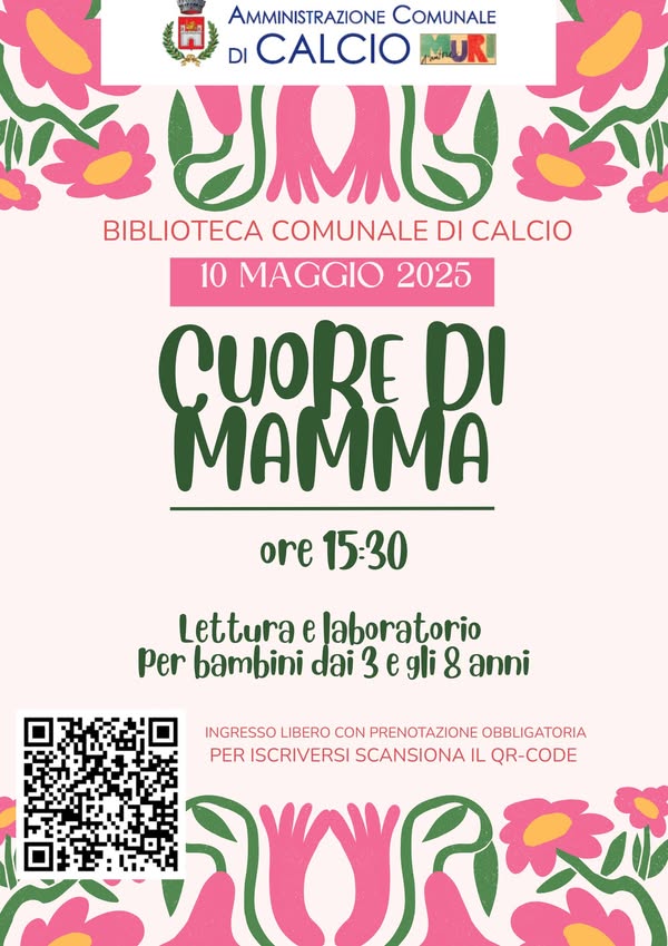 Sabato 10 maggio alle ore 15:30, presso la Biblioteca Comunale di Calcio, si terrà l’evento “Cuore di mamma”, lettura e laboratorio per bambini dai 3 agli 8 anni.
