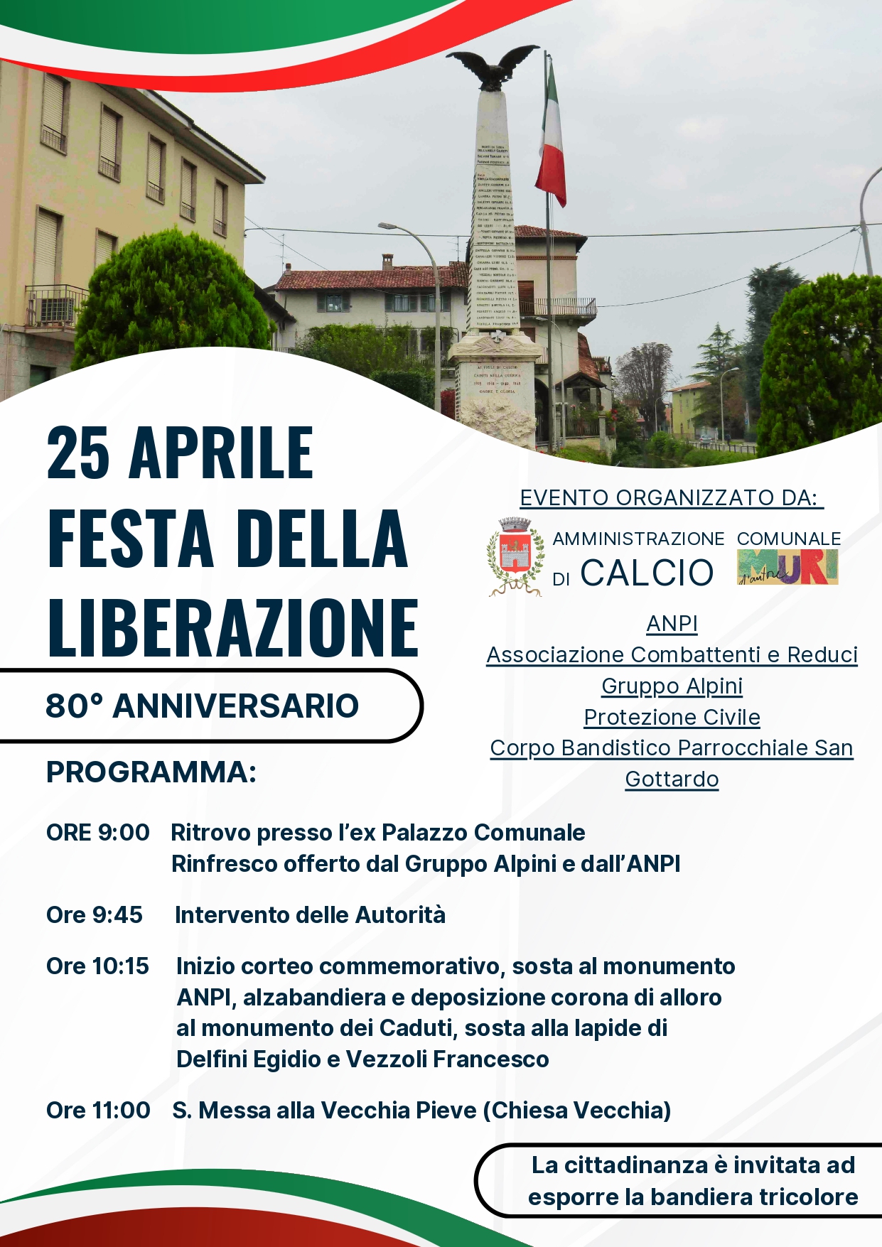 Venerdì 25 aprile 2025 dalle ore 9:00, a Calcio, si terrà l’ 80° anniversario della Festa della Liberazione.