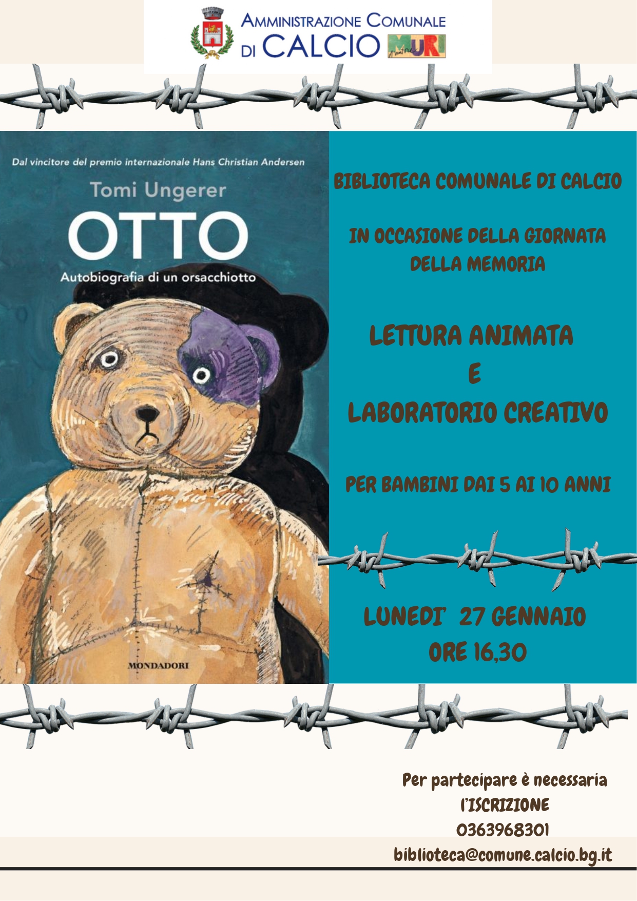 Lunedì 27 gennaio alle 16:30, presso la Biblioteca Comunale di Calcio, si terrà la lettura animata e laboratorio creativo “Otto, autobiografia di un orsacchiotto” in occasione della giornata della memoria.