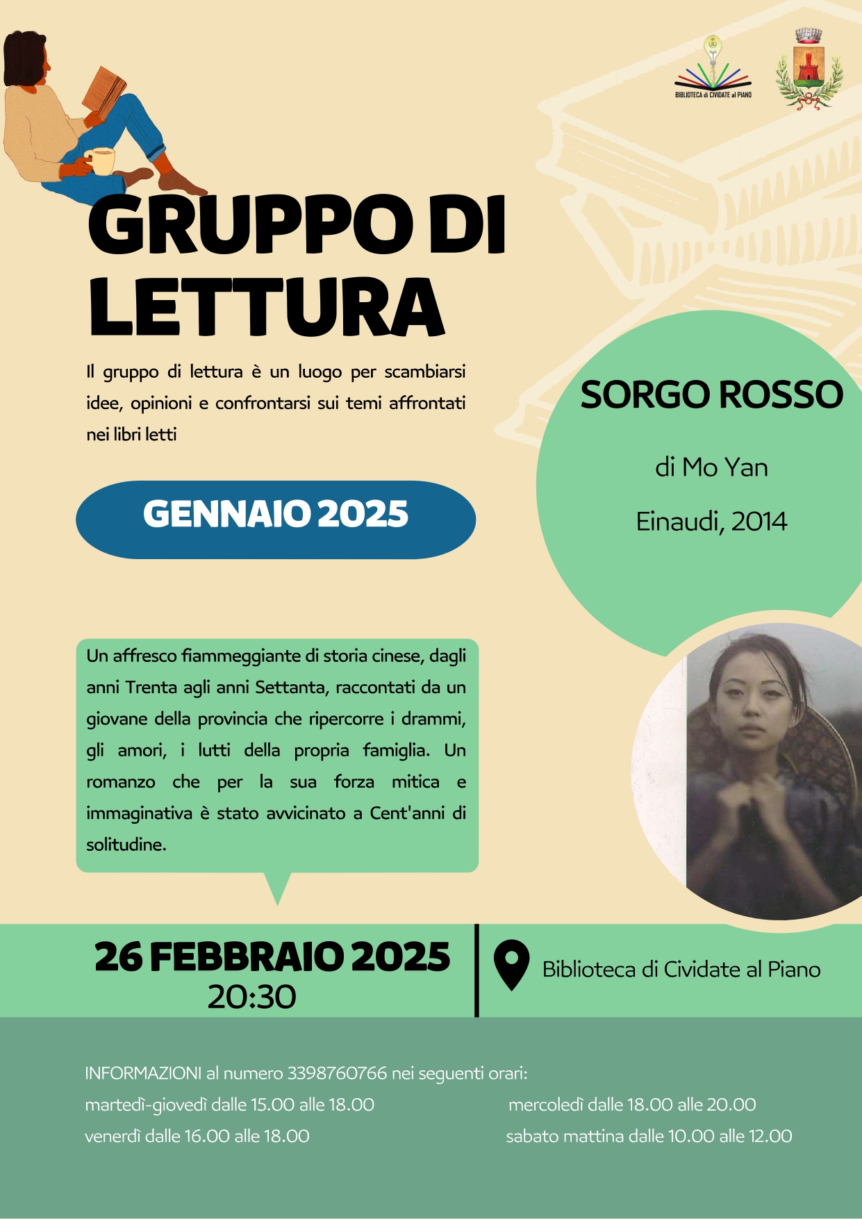 Mercoledì 26 febbraio alle ore 20:30, presso la Biblioteca comunale di Cividate al Piano, si terrà il gruppo di lettura durante cui si parlerà e si discuterà del libro intitolato “Sorgo Rosso” di Mo Yan.