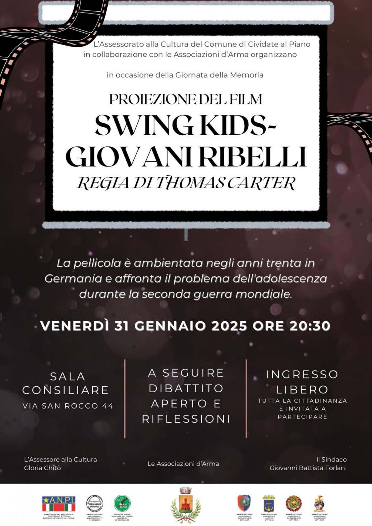 L’Assessorato alla Cultura del Comune di Cividate al Piano in collaborazione con le Associazioni d’Arma organizzano, in occasione della Giornata della Memoria, la proiezione del film “Swing Kids – Giovani Ribelli”, Regia di Thomas Carter.