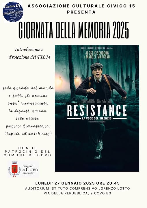 Lunedì 27 gennaio alle ore 20:45, presso l’Auditorium dell’Istituto Comprensivo Lorenzo Lotto a Covo, si terrà l’introduzione e proiezione del film “Resistance, la voce del silenzio”