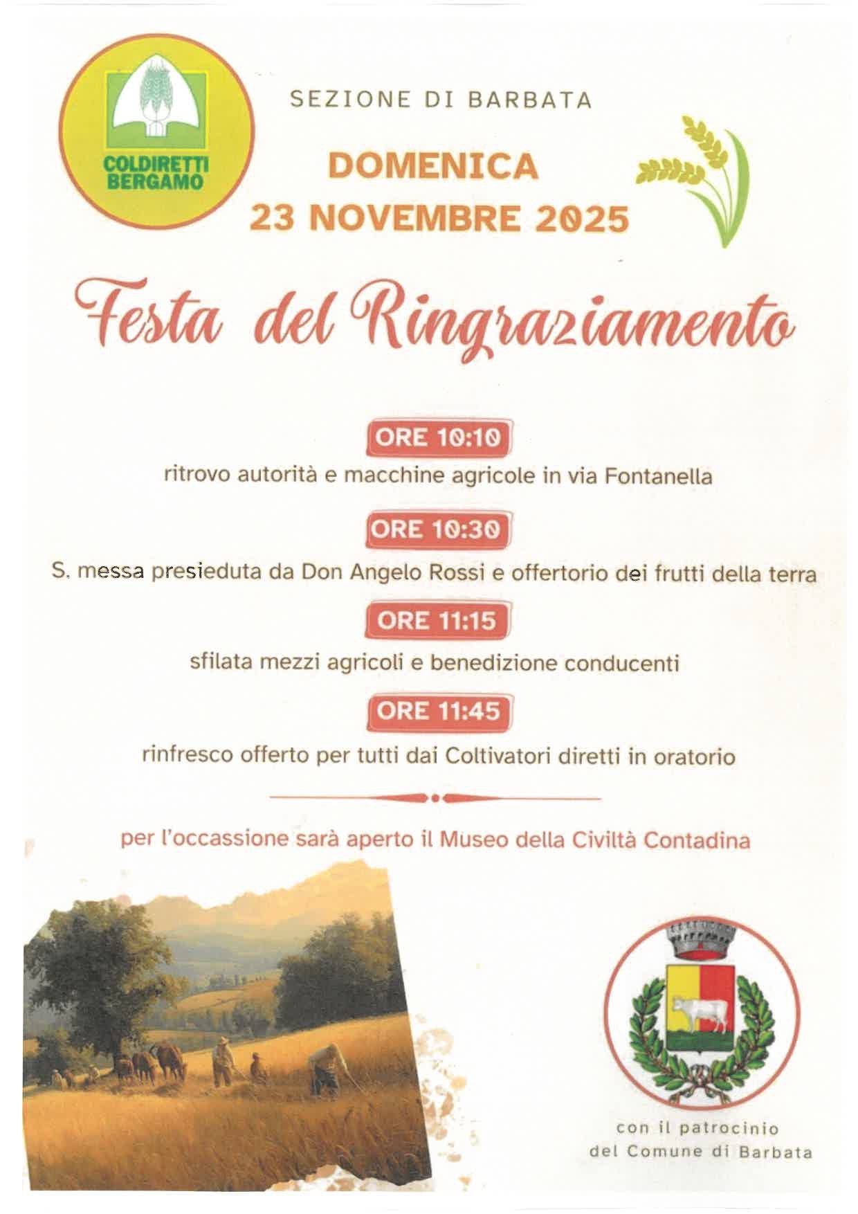 La Festa del Ringraziamento si celebrerà nella mattinata di domenica 23 novembre 2025, dalle ore 10:00. Potete consultare il programma completo nella locandina sotto allegata.