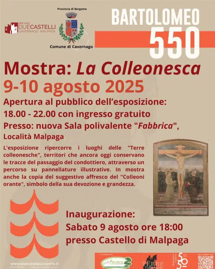 Allestita nella nuova sala polivalente “Fabbrica”, accanto al Castello di Malpaga, l’esposizione ripercorre i luoghi delle “Terre colleonesche”, territori che ancora oggi conservano le tracce del passaggio del condottiero, attraverso un percorso su pannellature illustrative. In mostra anche una copia del suggestivo affresco del “Colleoni orante”, simbolo della sua devozione e grandezza, proveniente dal convento dell’Incoronata di Martinengo e custodito presso il Luogo Pio della Pietà in Bergamo.