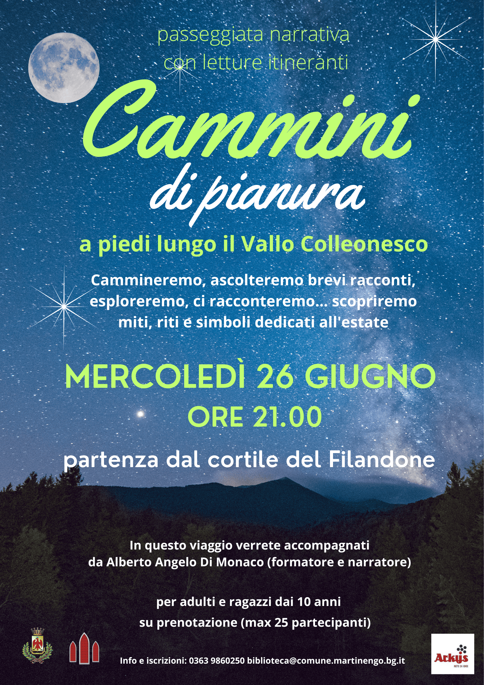 La biblioteca organizza una passeggiata narrativa con letture itineranti. “Cammini di pianura: a piedi lungo il Vallo Colleonesco”, si camminerà, verranno ascoltati brevi racconti, si esplorerà… verranno scoperti miti, riti e simboli dedicati all’estate.