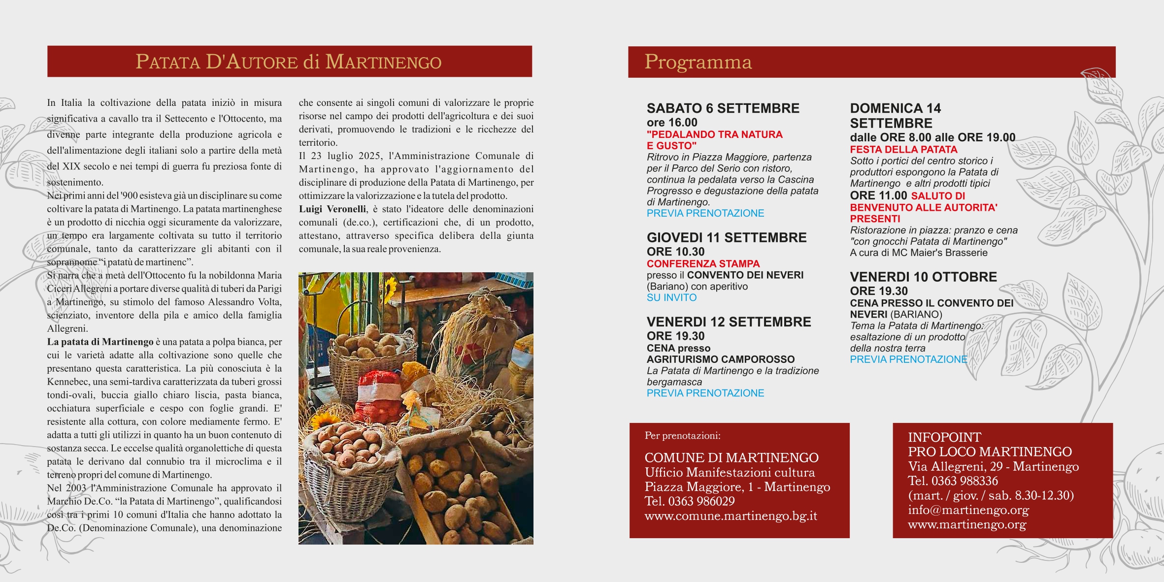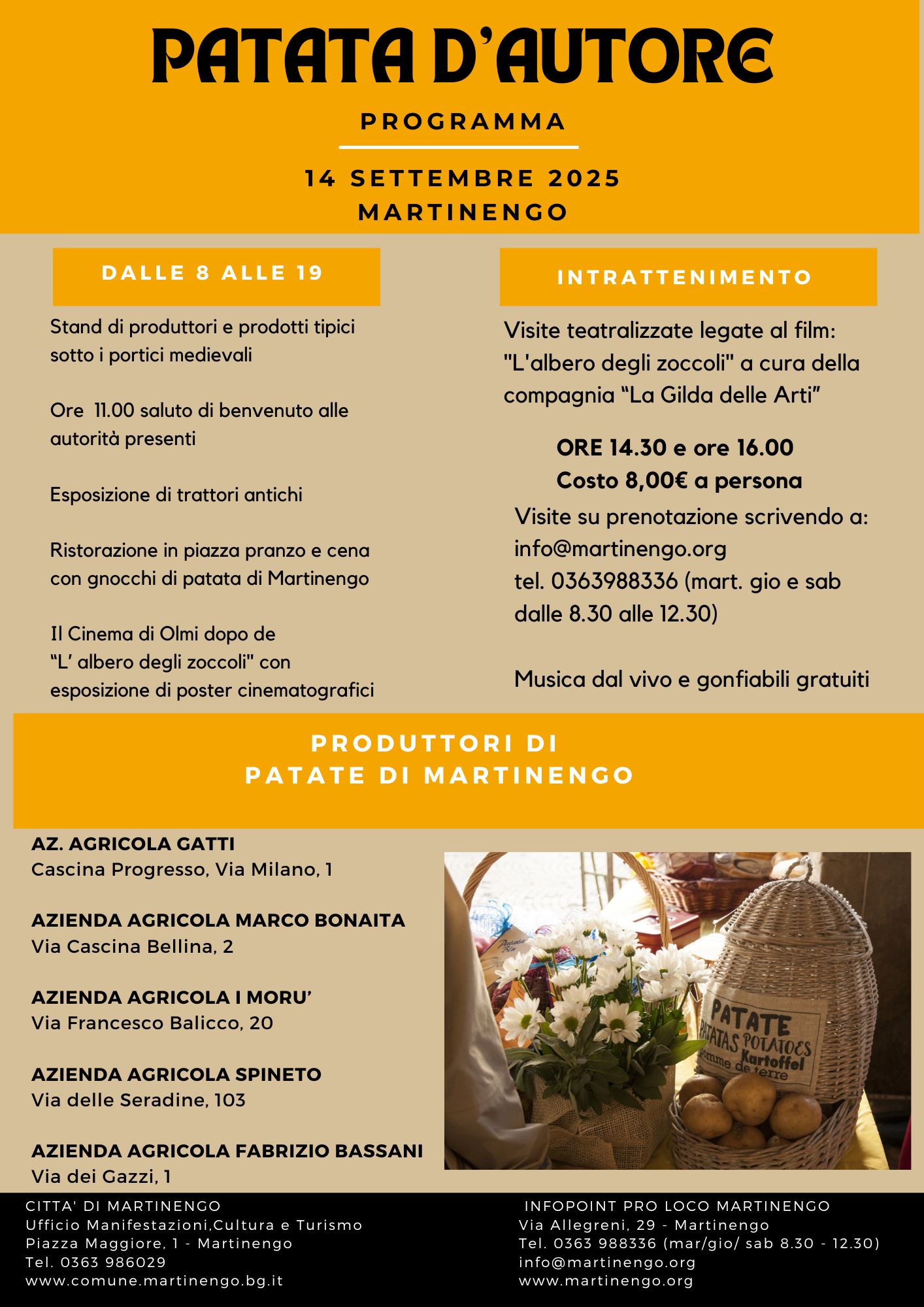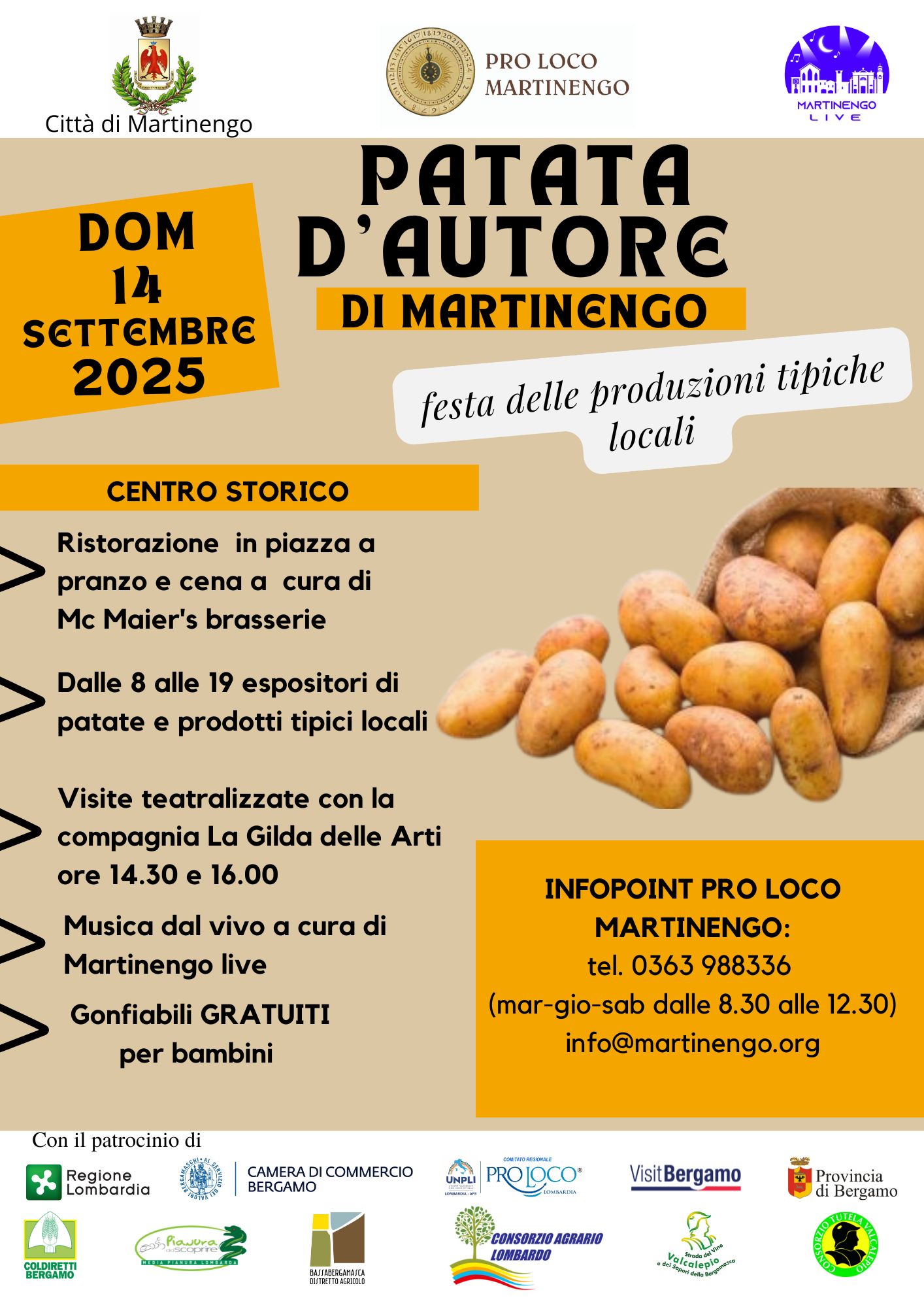 Domenica 14 settembre 2025 non prendete impegni: a Martinengo (BG) torna uno degli appuntamenti più attesi della stagione autunnale, “Patata d’autore”, la festa che celebra il celebre tubero De.Co. e le eccellenze gastronomiche della tradizione bergamasca.
