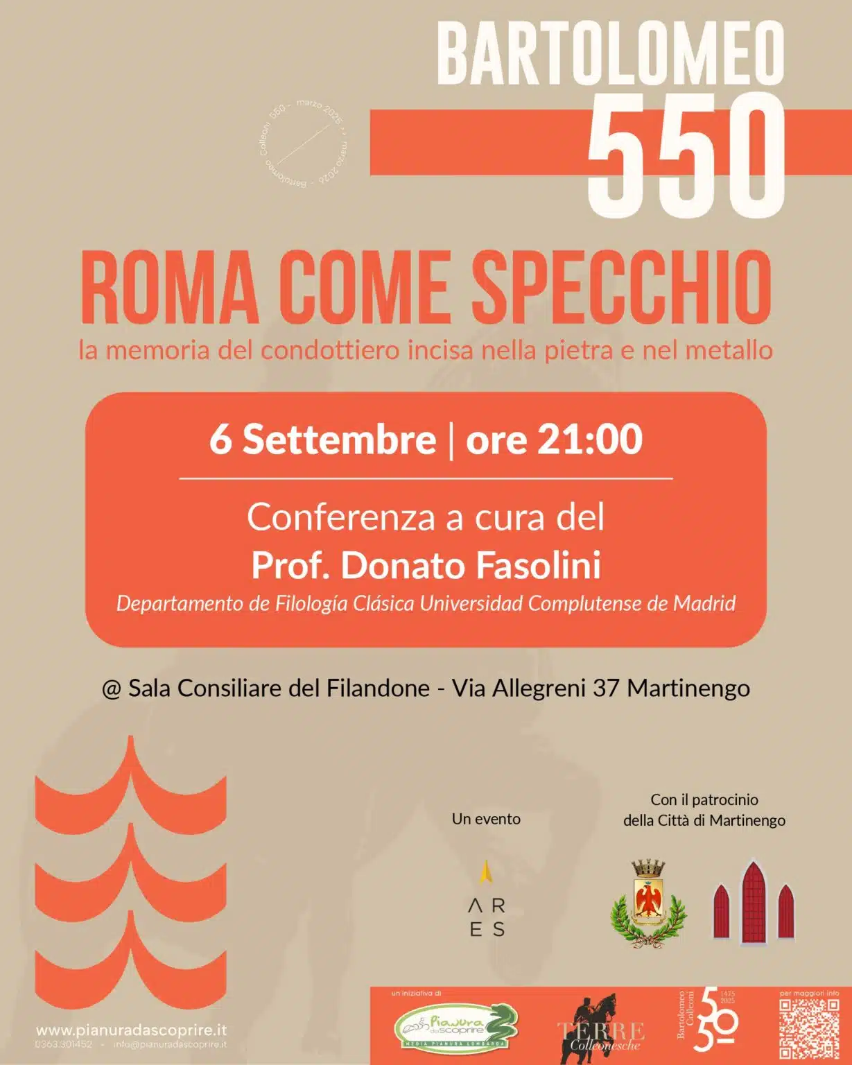 Questa conferenza esplora il legame tra Bartolomeo Colleoni, uno dei più celebri condottieri del Rinascimento italiano, e il mondo romano, inteso come modello politico/militare e riferimento simbolico ed estetico. Ci interrogheremo su come l’eredità dell’antica Roma abbia influenzato la sua figura e soprattutto come abbia rappresentato una fonte di ispirazione per definire quale memoria il Capitano volesse lasciare ai posteri.
