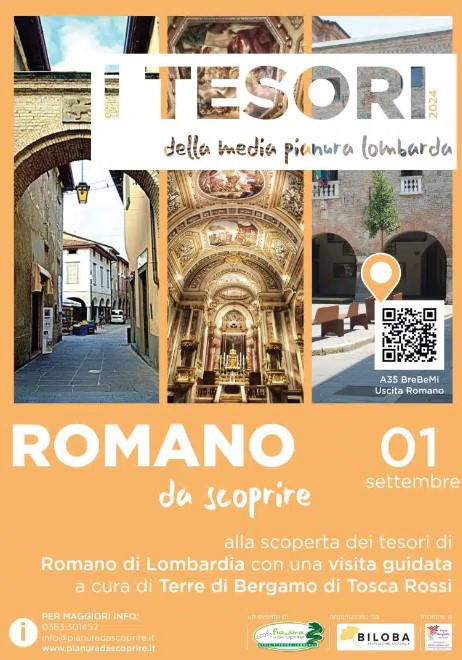 L’associazione Pianura da Scoprire e l’Associazione culturale Biloba con Terre di Bergamo di Tosca Rossi, nell’ambito delle giornate dedicate ai “Tesori della media pianura lombarda”, vi invitano domenica 1° settembre per una visita guidata all’insegna della riscoperta del territorio e della valorizzazione del comune di Romano di Lombardia.