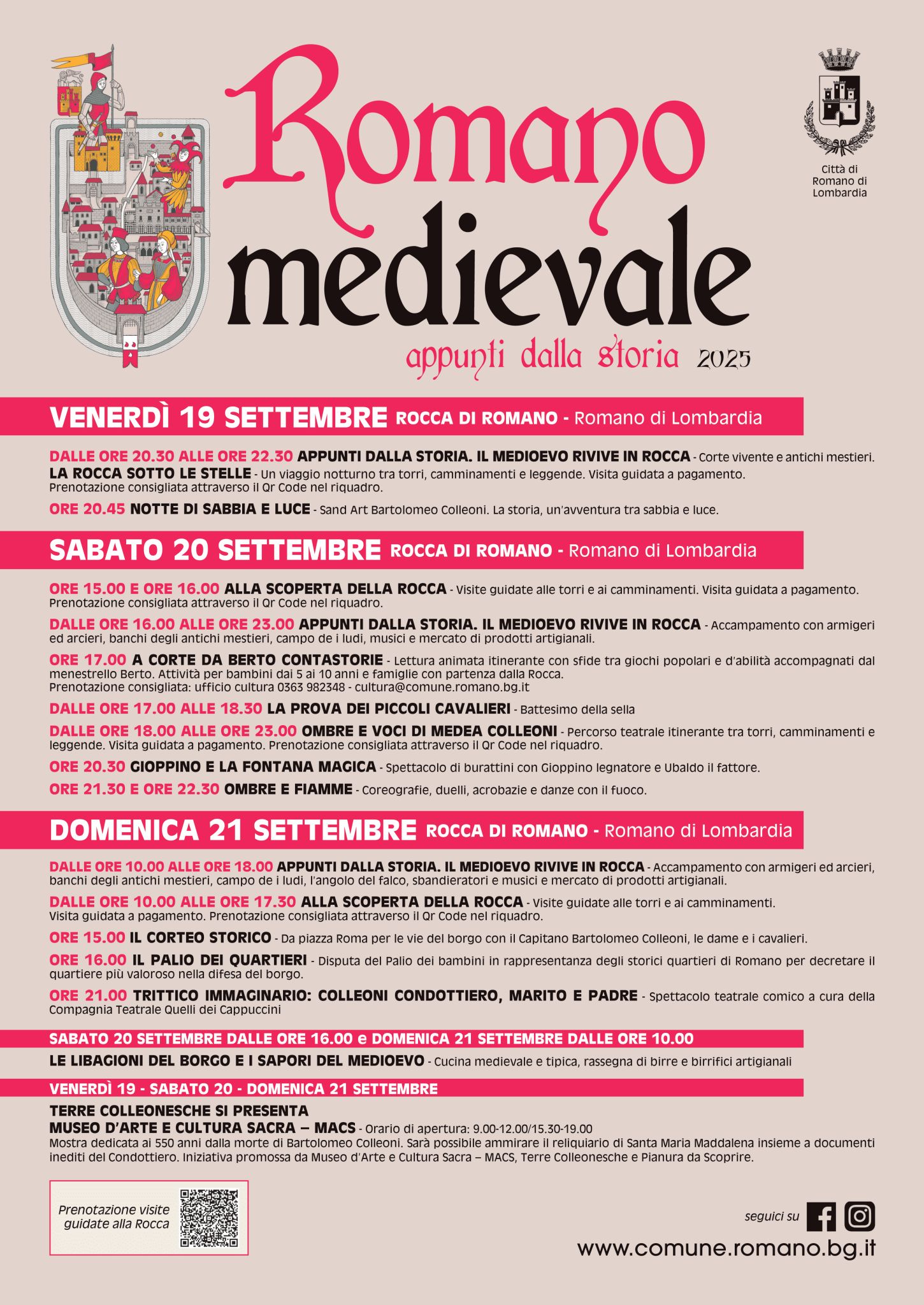 - OMBRE E VOCI DI MEDEA COLLEONI; percorso teatrale itinerante tra torri, camminamenti e leggende. Visita guidata a pagamento. Prenotazione consigliata attraverso il Qr Code nel riquadro in locandina.