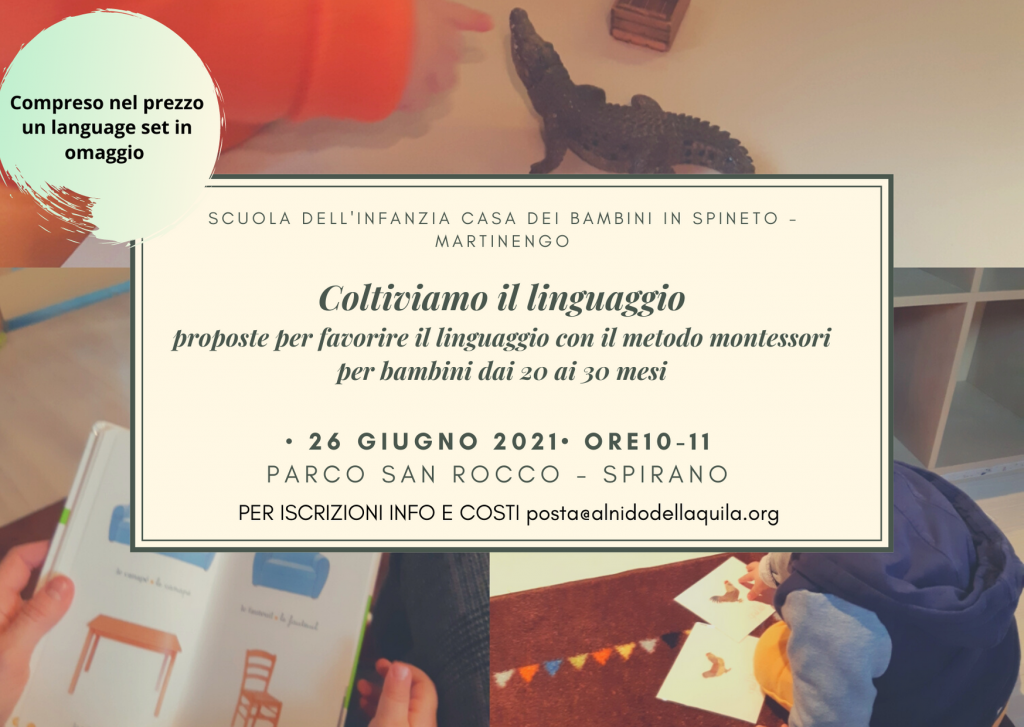Sabato 26 Giugno dalle 10.00 alle 11.00 la scuola dell’infanzia “Casa dei bambini in Spineto” di Martinengo organizza la conferenza “Coltiviamo il linguaggio. Proposte per favorire il linguaggio con il metodo montessori per bambini dai 20 ai 30 mesi”. Presso il Parco San Rocco di Spirano.